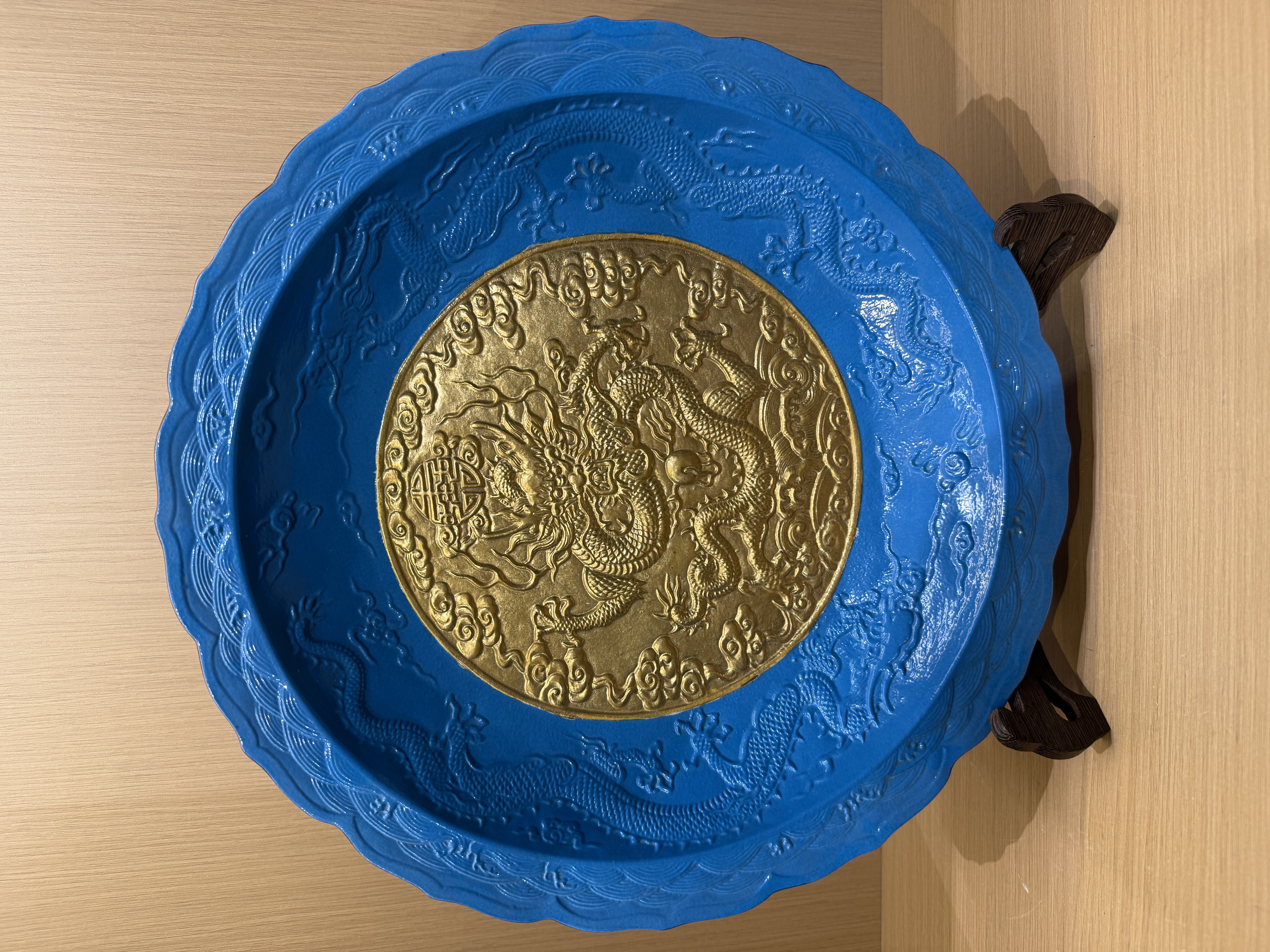 清早期 蓝地 重工刻金龙纹葵口赏盘
