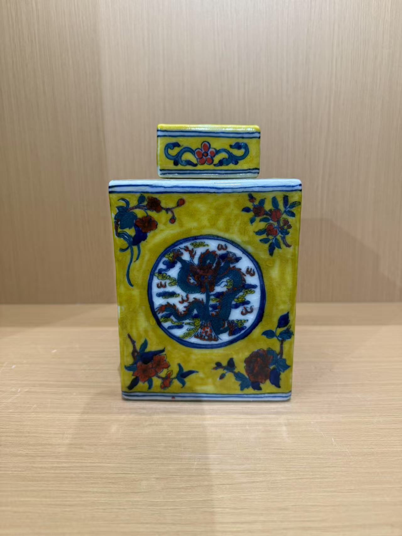清中晚期 四方黄釉龙纹盖罐