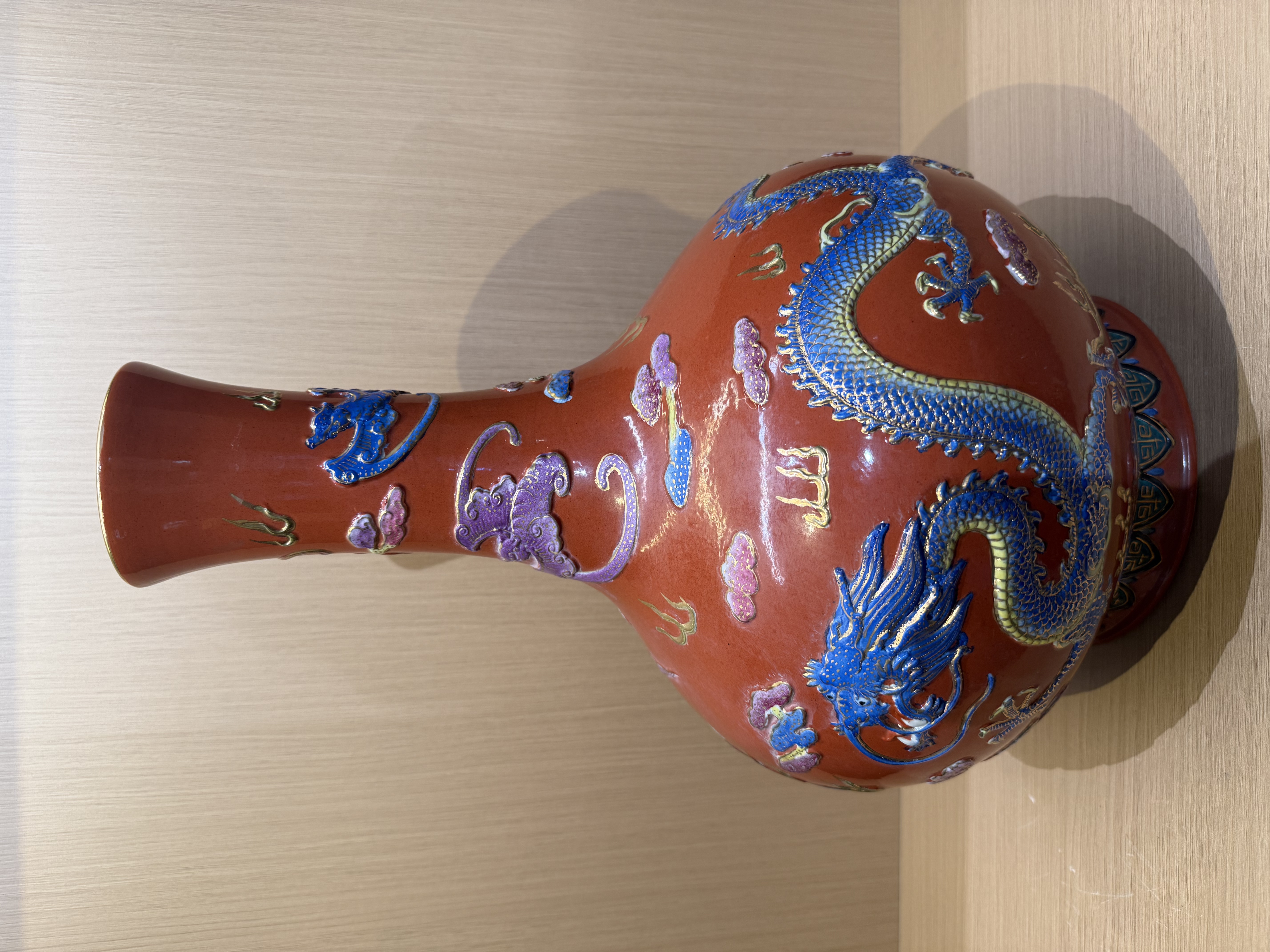 清早期 珊瑚红地重工雕刻龙纹天球瓶