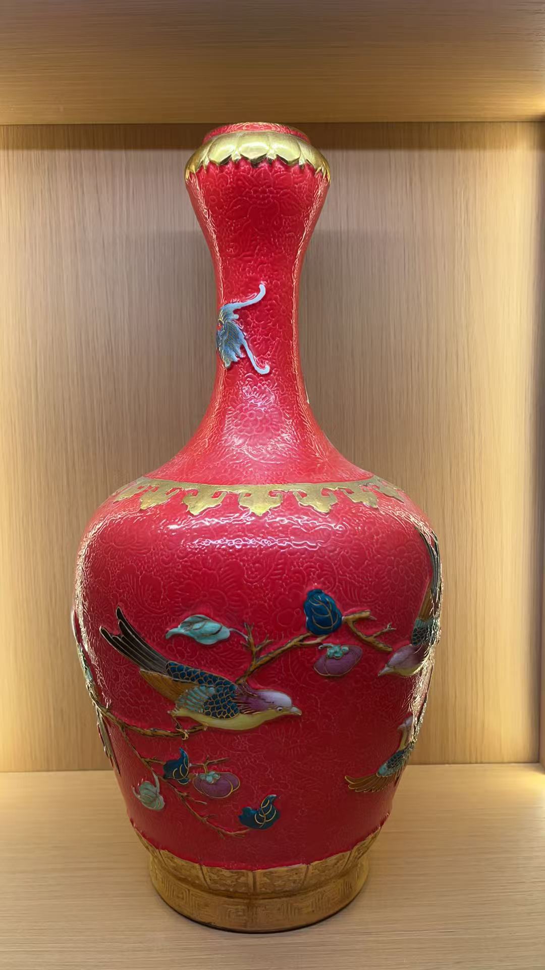 清乾隆 重工珐琅红地描金锦上添花蒜头瓶