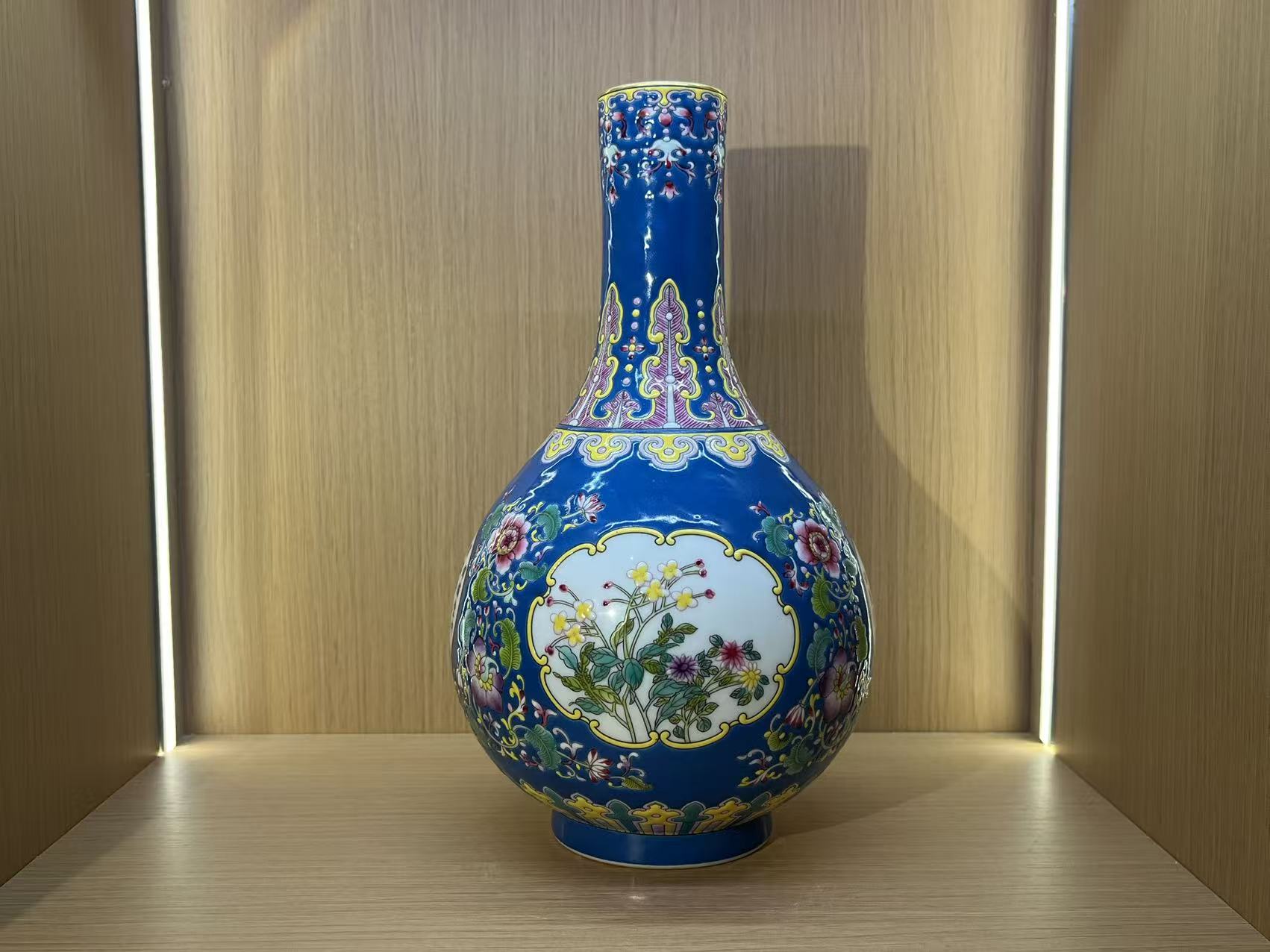 清雍正 重工珐琅蓝釉开窗胆式瓶