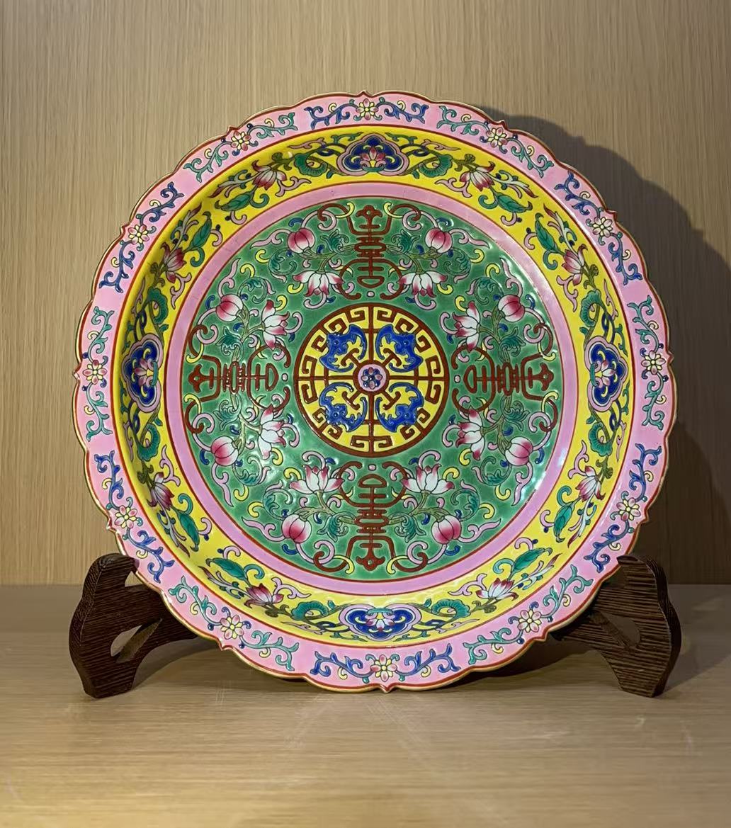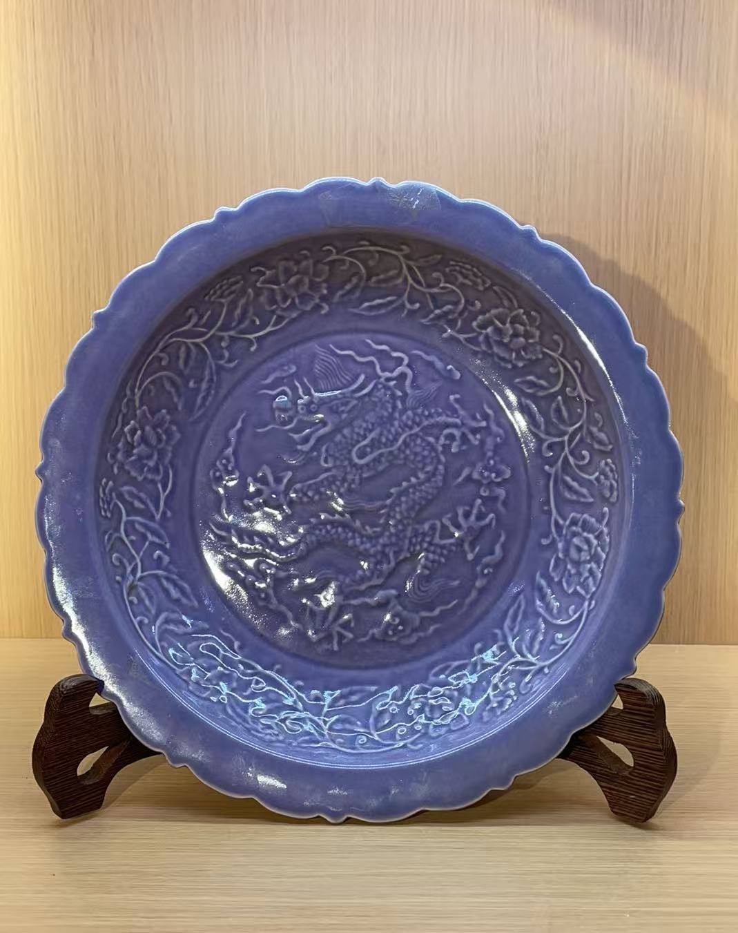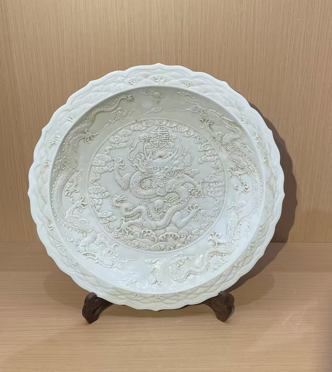 清 乾隆浮雕暗刻龙纹葵口大盘
