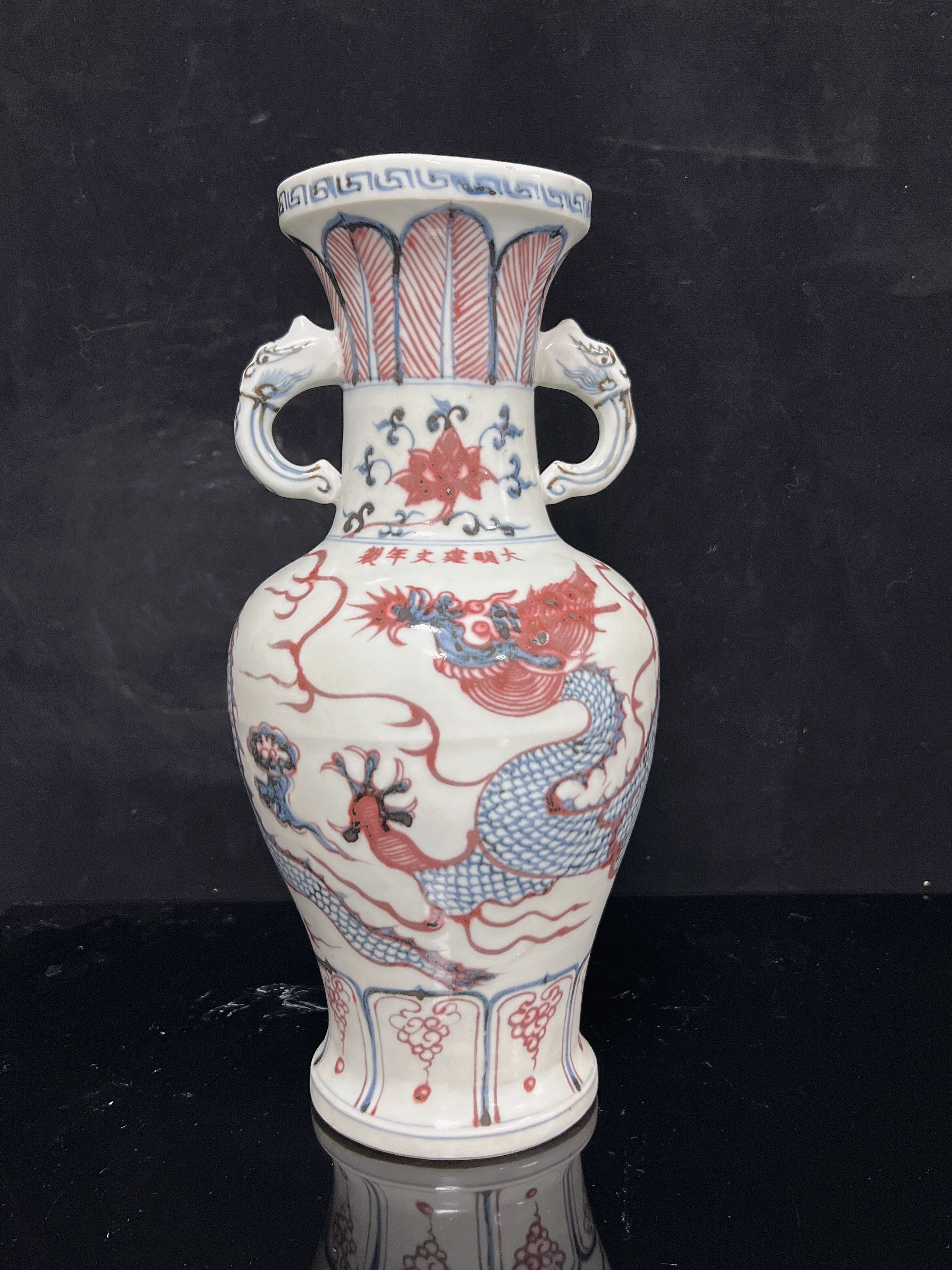 清雍正 青花双龙捧寿图绶带耳葫芦瓶