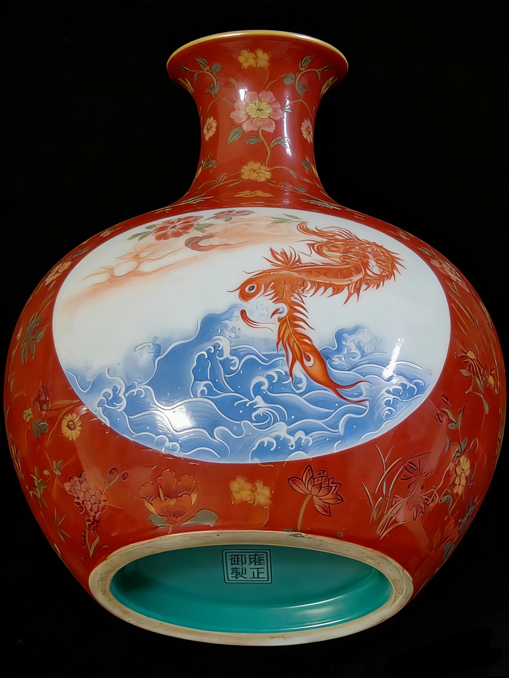 清 雍正珊瑚红龙凤开窗双耳抱月瓶